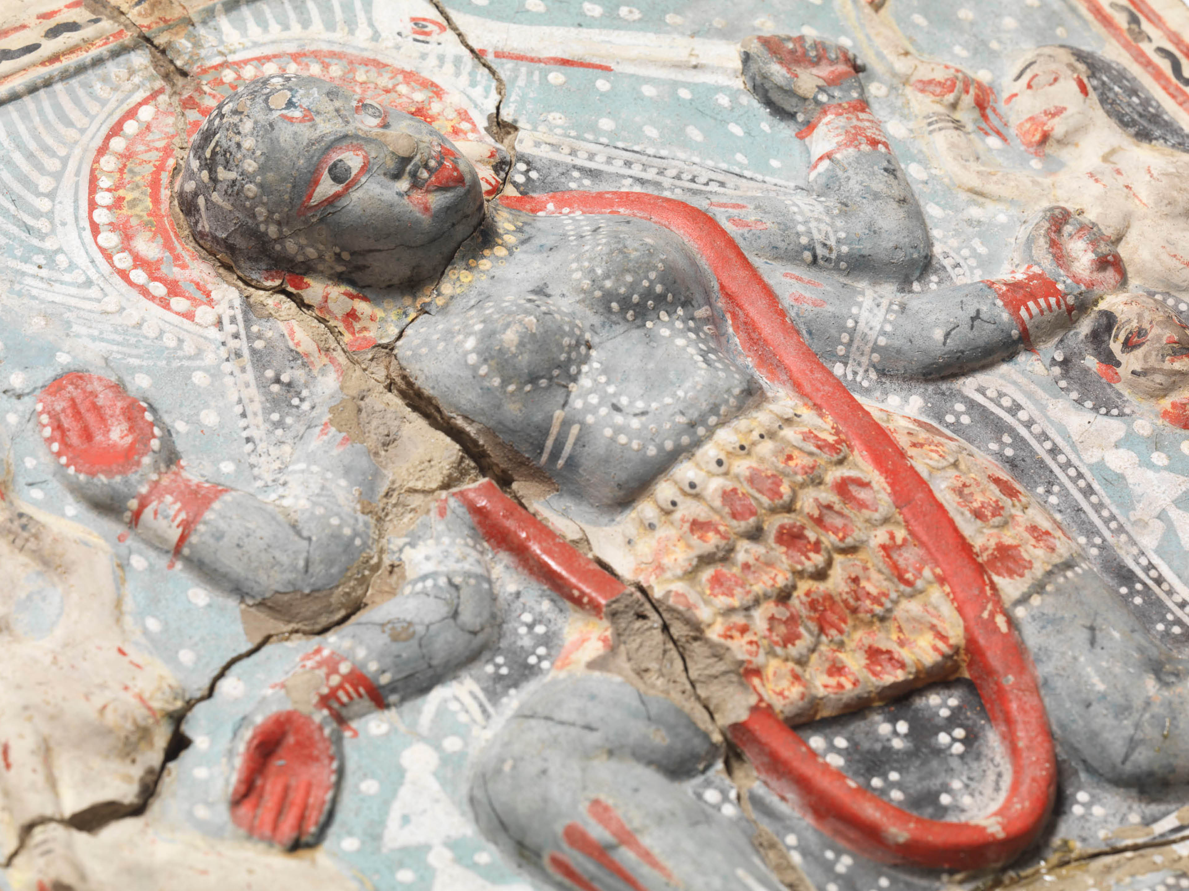 <p>Während ihrer Erklärung zur letzten Station werden Terrakottareliefs mit einer Hindugöttin,, grosse Holzpfosten sowie Buddhaköpfe aus Stein gezeigt.</p>