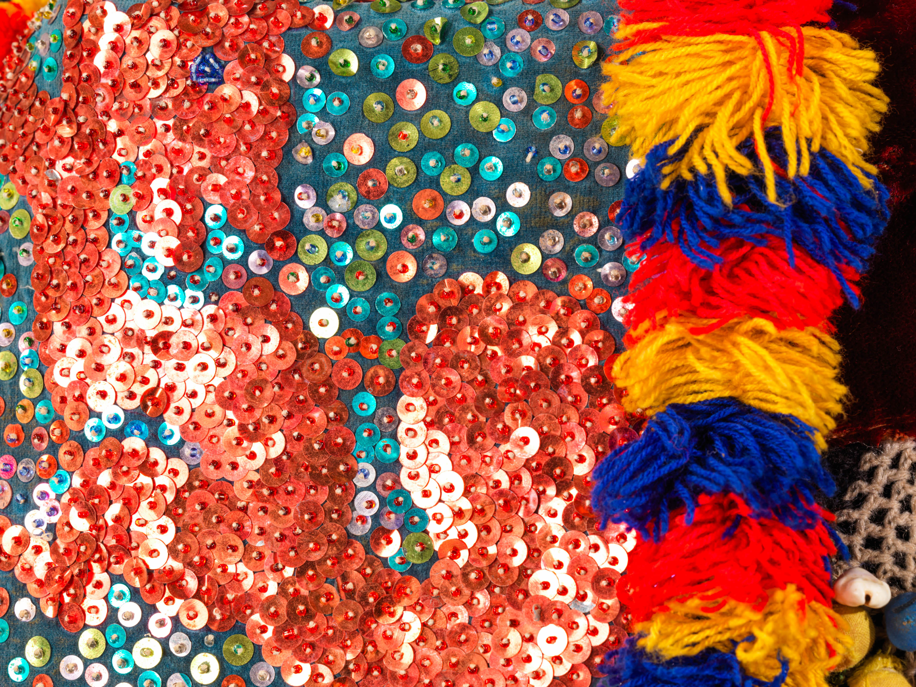 <p>Musik ertönt. Es folgen Nahaufnahmen eines Bildes, das mit Glasperlen bestickt ist, eine reich verziertes und besticktes Maskenkostüme sowie eins schamanischen Gewands aus braunem Leder, das vollbehängt ist mit Metallplatten, -ringen und kleinen Glocken. Es folgt die Aufnahme von zwei runden Behältern aus Leder.</p>