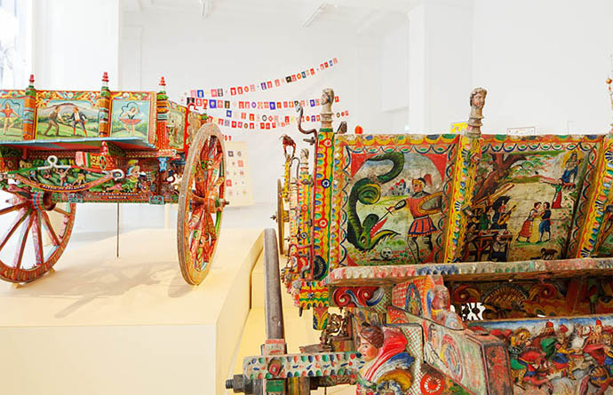 Le paysage pittoresque de Sicile est entre autres marqué par les énormes bosquets d'oranges et de mandarines. L'origine de ces agrumes nous est révélée par leur papier d'emballage, sur lequel figure, outre des informations sur le fournisseur et la marque, le plus souvent une image colorée. Les «papiers à orange» siciliens sont les ambassadeurs de leur région d'origine. Ces emballages colorés, tout comme les charrettes à ânes sur lesquelles sont transportés les fruits, nous servent de point de départ pour un voyage aux couleurs somptueuses dans la culture populaire sicilienne. L'exposition de Noël montre entre autres choses comment naissent des signes régionaux d'identité et comment on les renforce et les transmet.