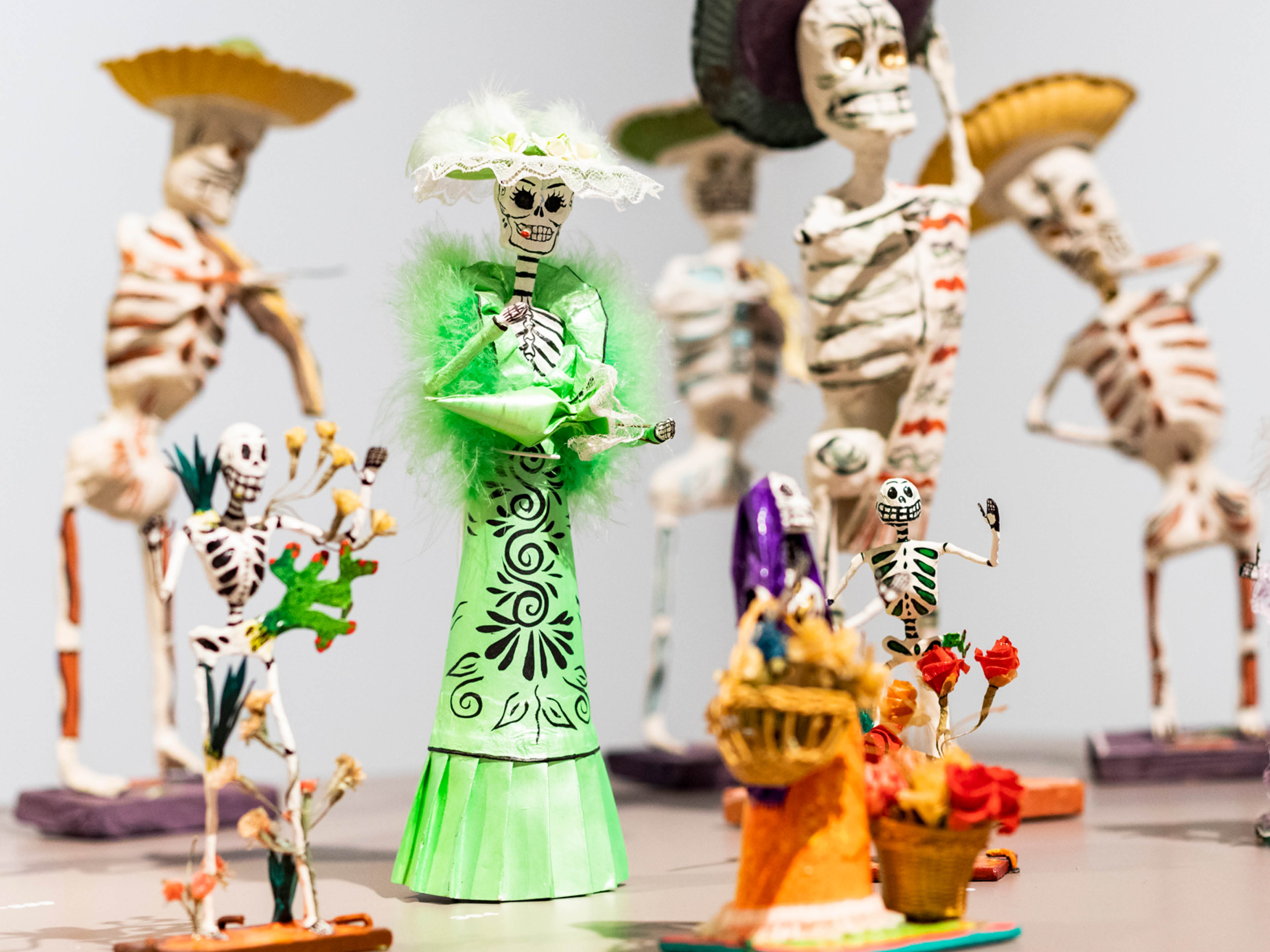 L’exposition s’achève par la commémoration des morts. En Europe, les tableaux de cheveux, les monuments en pierre et les croix funéraires nous rappellent les défunts. Au Mexique, les morts sont joyeusement célébrés lors du « Día de los Muertos ». Formant un drôle de spectacle, des ensembles de squelettes dansent alors sur une plateforme d’exposition. Au Pérou, en revanche, l’ethnie des Matsiguenga sculpte des gardiens en bois pour protéger les vivants des morts.