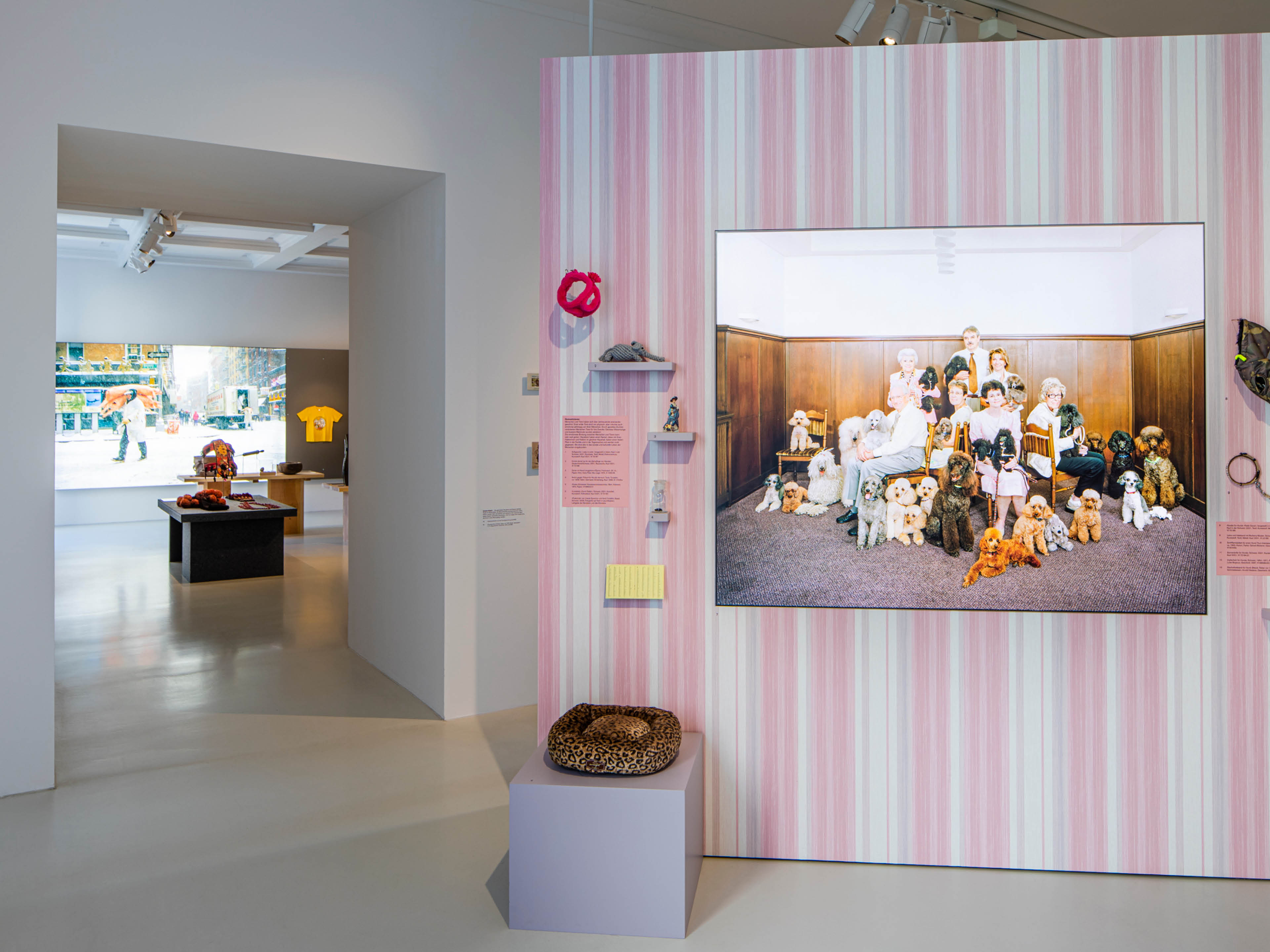 Cette photo attire immédiatement les visiteuses et visiteurs dans l’exposition. Tout comme l’espace environnant, elle transmet une atmosphère douillette de salle de séjour. Une pièce dans laquelle l’homme et l’animal sont tous deux chez eux. La laisse, le sweat-shirt à capuche et le carnet de vaccination le soulignent.